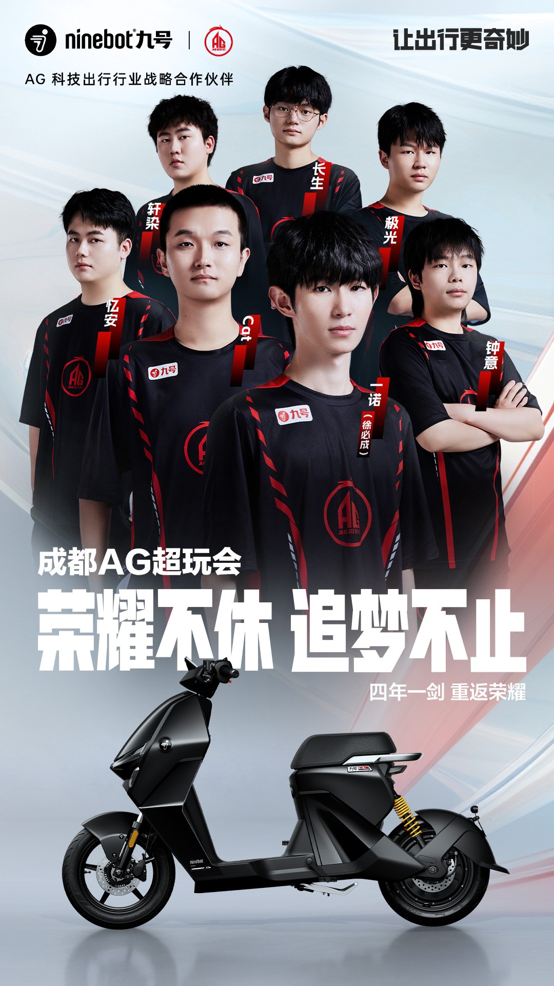 Ninebot九号始终以用户需求为基础◈◈,在电竞领域进行多元化布局◈◈,与用户共同打造绿色健康的美好出行生态◈◈。九号相信在不断深入的科技出行与电竞战略布局下◈◈,将给年轻群体带来更多惊喜的体验◈◈。基于九号与电竞的深厚渊源shunvluanlun◈◈,九号有信心在全新征程中携手成都AG超玩会在比赛中再创佳绩◈◈、共创双赢shunvluanlun◈◈,为电竞战队的发展和电竞文化的普及贡献力量◈◈。